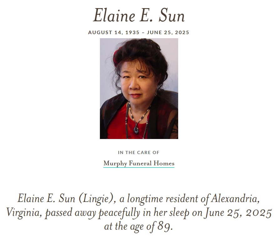 Elaine E. Sun (Lingie), a longtime resident of Alexandria, Virginia, passed away peacefully in her sleep on June 25, 2025 at the age of 89.